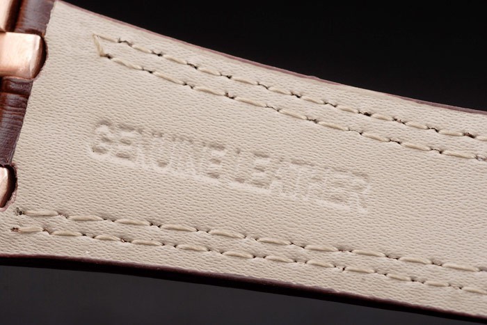 pulseira: Calor em relevo Audemars Piguet Castanho Escuro Castanho Crocodilo Cinta de Couro Com Costura Branca Dupla e Audemars Piguet Gravado Rose-Gold Banhado Folheto Folheto – Bracelet Comprimento: 220 x 25 mm | Banhado parafusado para baixo Bezel