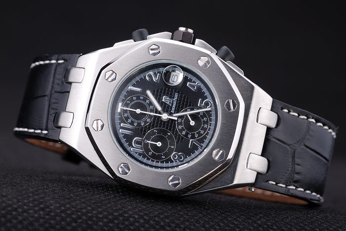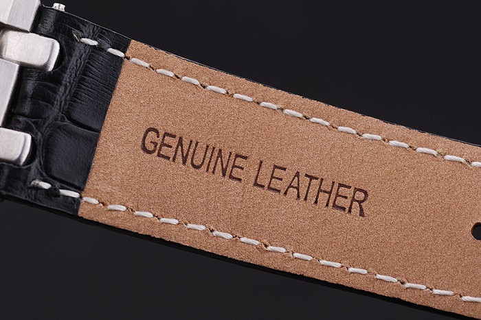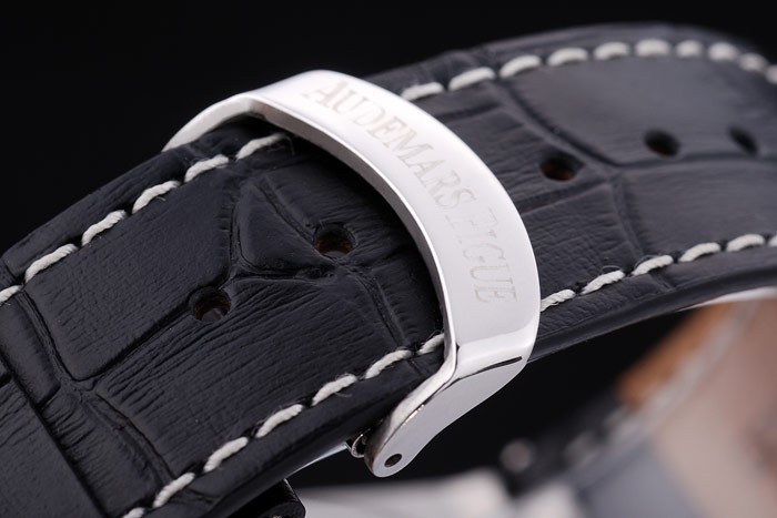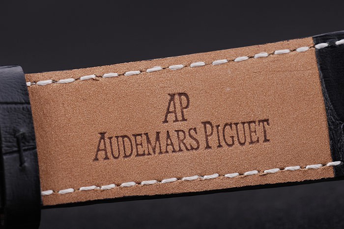 Bracelete: Cinta de couro de crocodilo preto com costura branca e calor em relevo Audemars Nome e logotipo e logotipo e um Audemars Piguet Inscrito Aço Inoxidável Flip-Sob Gancho Clasp