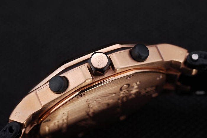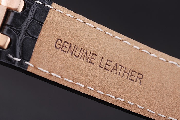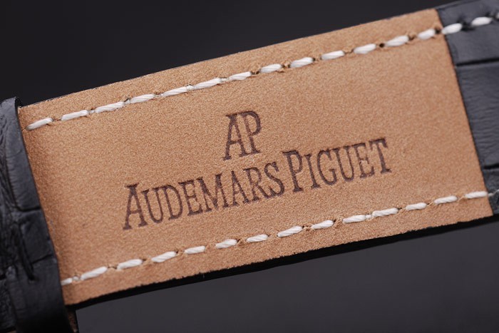 Cor: 18k Caixa de aço inoxidável banhado a ouro rosa: pulseira de couro de crocodilo preto com costura de fio branca e calor em relevo nome e logotipo Audemars e logotipo e um Audemars Piguet Rose-Gold Plated Flip-Sob Gancho Clasp: 247 x 22 Mm