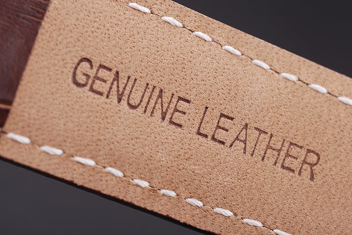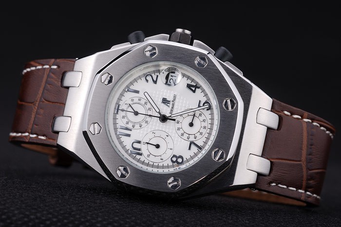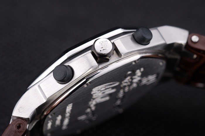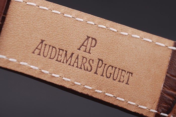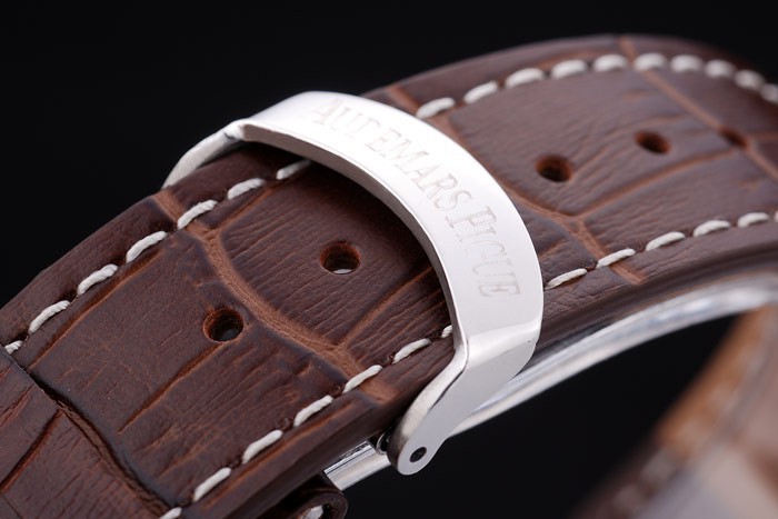 Bracelete: cinta de couro de crocodilo marrom escuro com costura branca de linha e calor em relevo Audemars Nome e logotipo e logotipo e um Audemars Piguet Inscrito Aço Inoxidável Flip-Sob Gancho Clasp