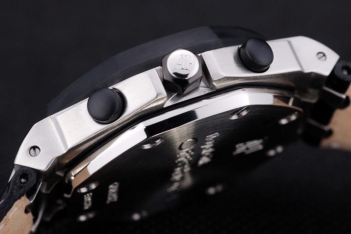 Clasp de relógio: fecho de virar de vidro: Cristal de safira: aço inoxidável Audemars Piguet Logo Gravado ion ião Coroa de corte com duas pequenas coroas banhadas a íon em ambos os lados da espessura do caso: 16 mm de