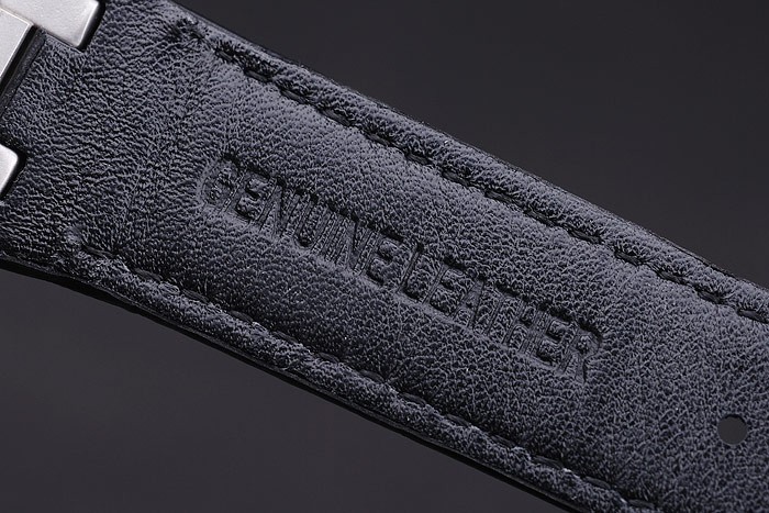 pulseira: black crocodilo cinta de couro com costura de fio branca e calor em relevo Audemars Nome e logotipo e logotipo e um Audemars Piguet Inscrito Aço Inoxidável Flip-Sob Gancho Clasp
