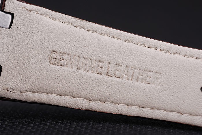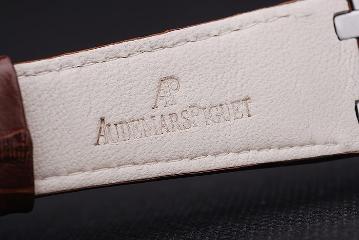 pulseira: Cinta de couro de crocodilo marrom com costura de fio branca e calor em relevo Audemars Nome e logotipo e um Audemars Piguet Inscrito Aço Inoxidável Flip-Over Gancho Clasp