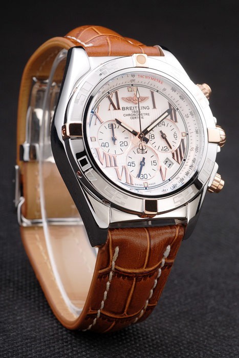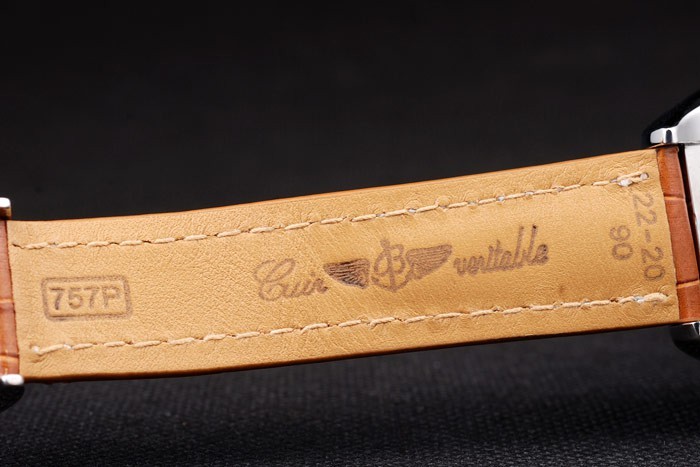 Cor: Caso de aço inoxidável polido Br>Bracelete: cinta de couro de crocodilo marrom com costura branca de patente e calor gravado gravado de Breitling e dobra de aço inoxidável gravada no fecho com logotipo de Breitling na parte superior