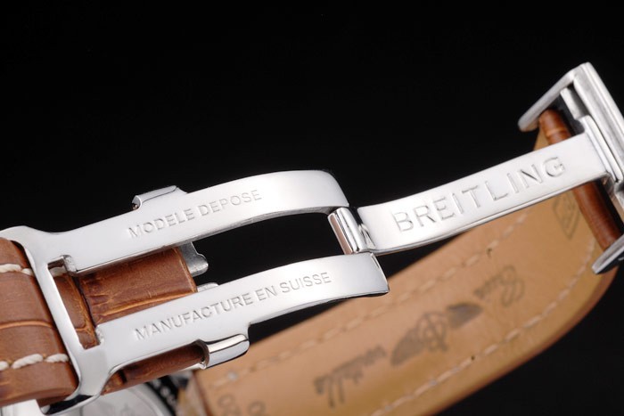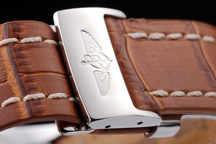 Bracelete: cinta de couro de crocodilo marrom com costura branca de patente e calor gravado gravado de Breitling e dobra de aço inoxidável gravada no fecho com logotipo de Breitling na parte superior