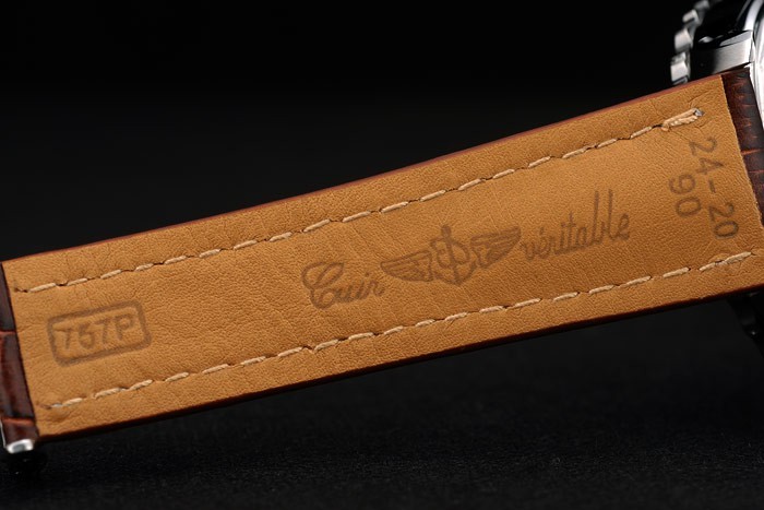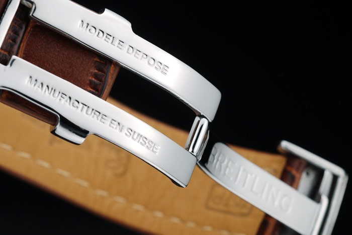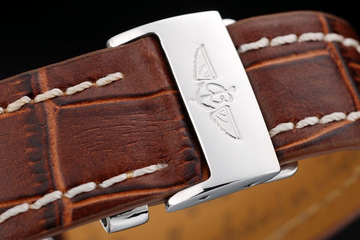 Bracelete: Calor em relevo Breitling Nome e logotipo Craque de couro de crocodilo marrom com fio branco stiching e logotipo gravado de aço inoxidável de aço inoxidável fechado