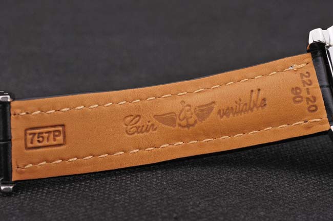 Pulseira: couro preto de alta qualidade em um padrão de crocodilo, com costura de algodão branco pesado. A banda interna tan é gravada com o nome e o logotipo Breitling, e tem um fechamento de fivela de aço.