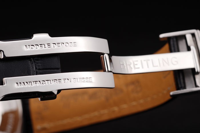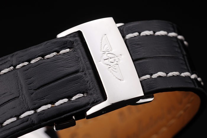 Pulseira: Calor rebocado Breitling Black Crocodile Strap de couro com costura de rosca branca e um logotipo Breitling gravado de aço inoxidável de aço inoxidável de