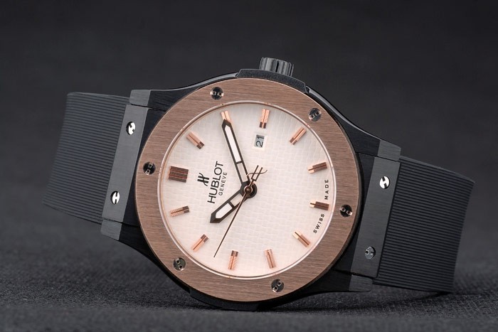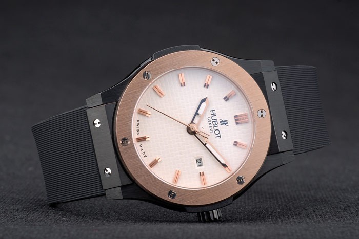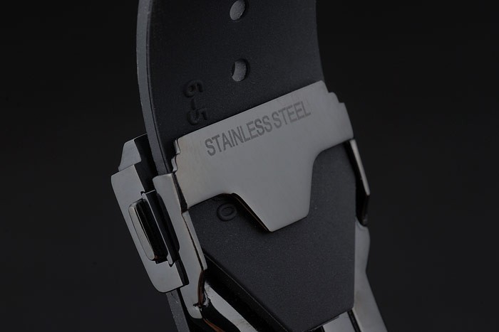 caso: Caso de aço inoxidável banhado a íon : Hublot Geneve Calor Embossed Cinta de borracha preta com nervuras com Hublot Geneve Gravado Ion-banhado ion-plated Push Gancho Clasp