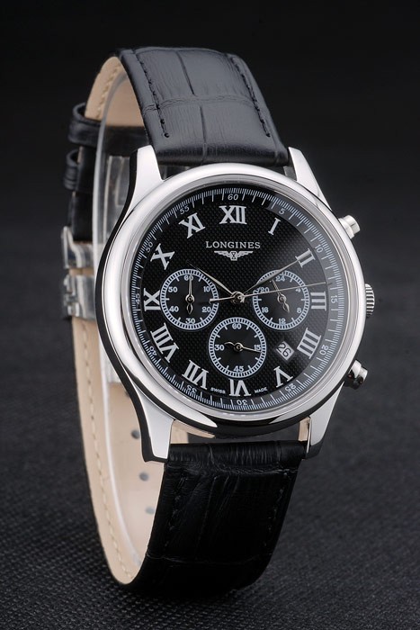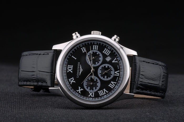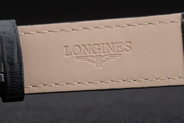 Capa de Aço Inoxidável: Pulseira: Longines Heat Cinta de couro de crocodilo preto em relevo com logotipo Longines inscrito e polido fecho de gancho de aço inoxidável
