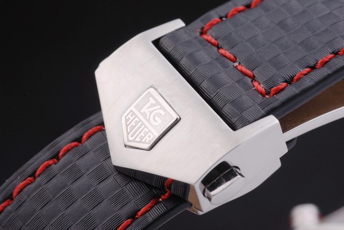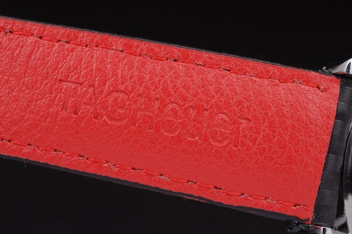 Capa de aço inoxidável: Bracelete: Preto Cinta de couro com costuras coloridas vermelhas e um tag Heuer marcando e escovado fecho de implantação de aço inoxidável