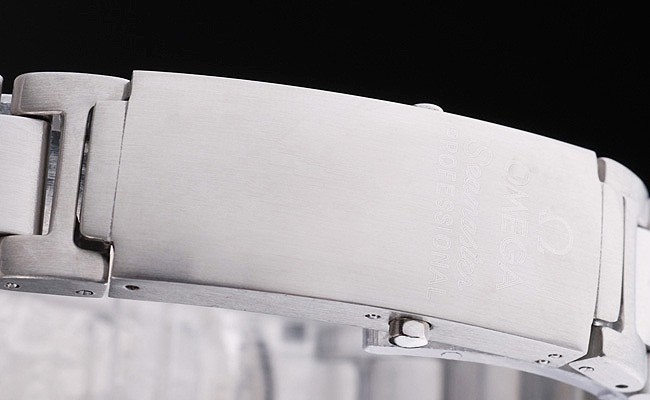 Capa Aço Inoxidável: Bracelete: Inoxidável escovado Bracelete de elo de aço com nome ômega e logotipo inscrito botão de implantação de lançamento de lançamento de lançamento