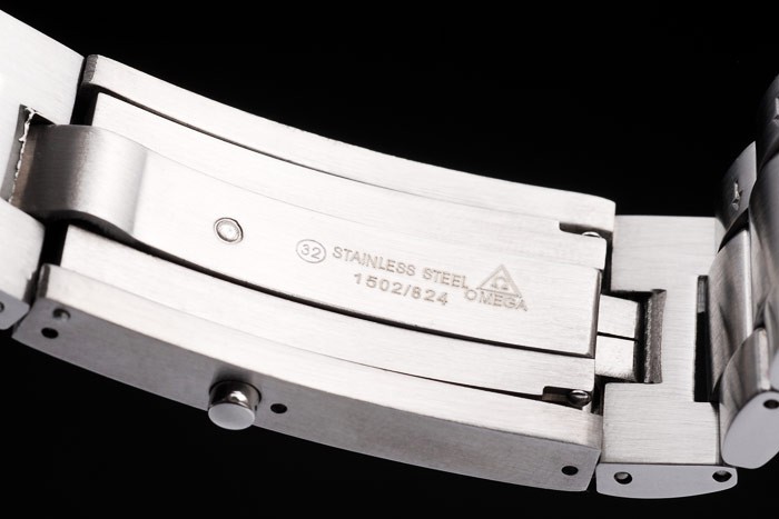 Capa de aço inoxidável: Bracelet: Bracelete de elo de aço inoxidável escovado com Omega Inscrigido Folha-Over Push-Release Clasp