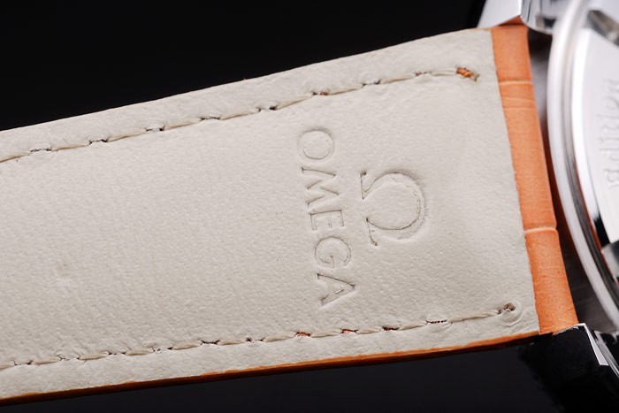 Caso de aço inoxidável Br>Pulseira: Calor Embossed Omega Nome e logotipo Alta de couro Crocodilo laranja com Omega Logo gravado polido de aço inoxidável dobra -in fecho de aleta e comprimento de pulseira: 210 x 22 mm