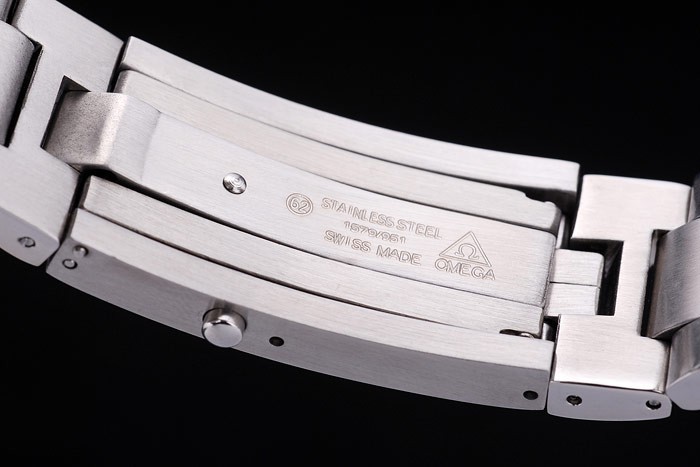 de vidro: Cristal de safira e coroa: polido coroa de aço inoxidável de aço inoxidável com o logotipo ômega mais outra coroa semelhante no canto superior oposto