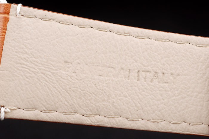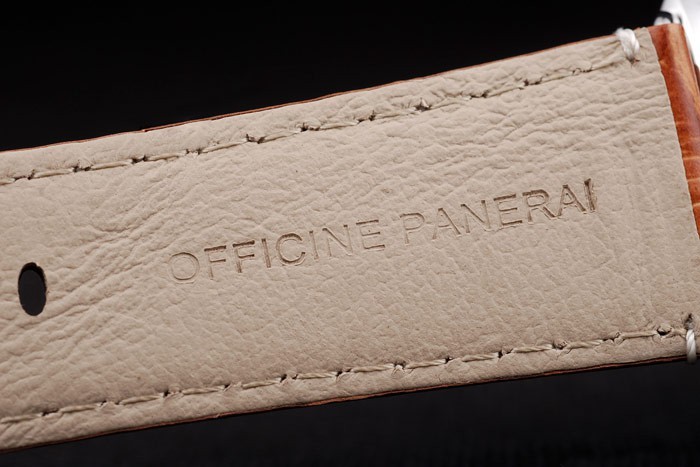 pulseira de couro de crocodilo marrom com costura branca e calor em relevo workshops Panerai Itália selo e polido fecho de aço inoxidável de aço inoxidável com gravação de Panerai