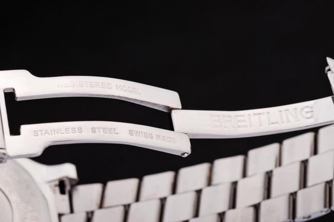 Pulseira: links polidos de aço inoxidável de 440 graus sólidos para um brilho alto, preso com um fechamento de fivela de aço em relevo com o nome e logotipo Breitling.