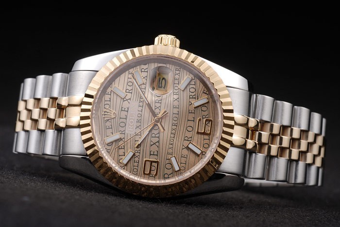 Capa: Pulseira: Pulseira: Duas pulseira de link em tons em aço inoxidável escovado e aço amarelo 18k de aço banhado a ouro com rolex gravado clasp escondido exibindo o logotipo Rolex
