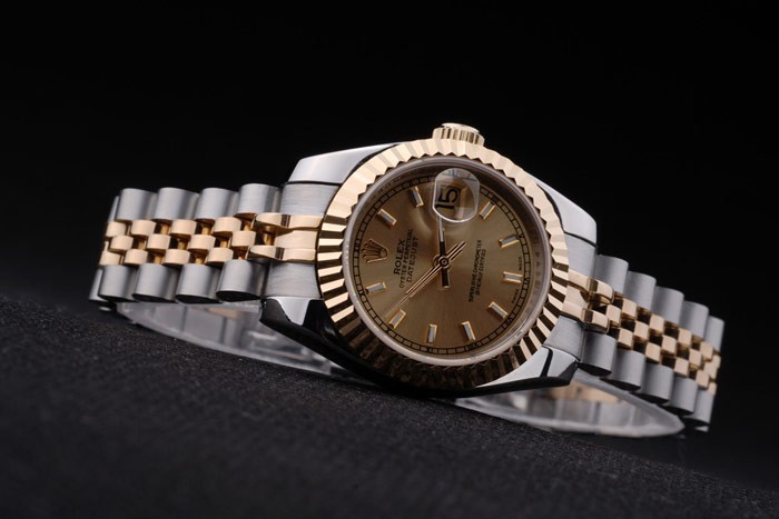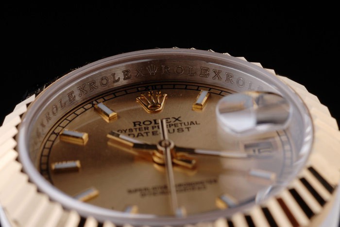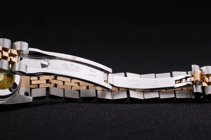 Caso de aço inoxidável: Pulseira: Duas pulseiras de links em aço inoxidável polido e aço amarelo 18k de aço banhado a ouro com Gravura de Rolex Clasp escondido exibindo o logotipo Rolex