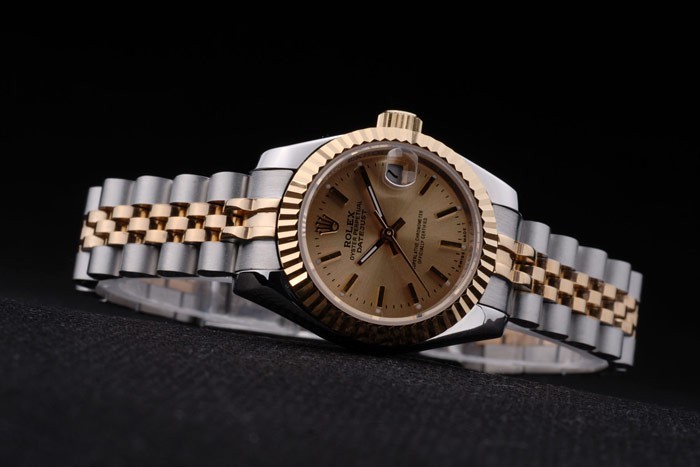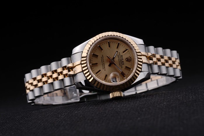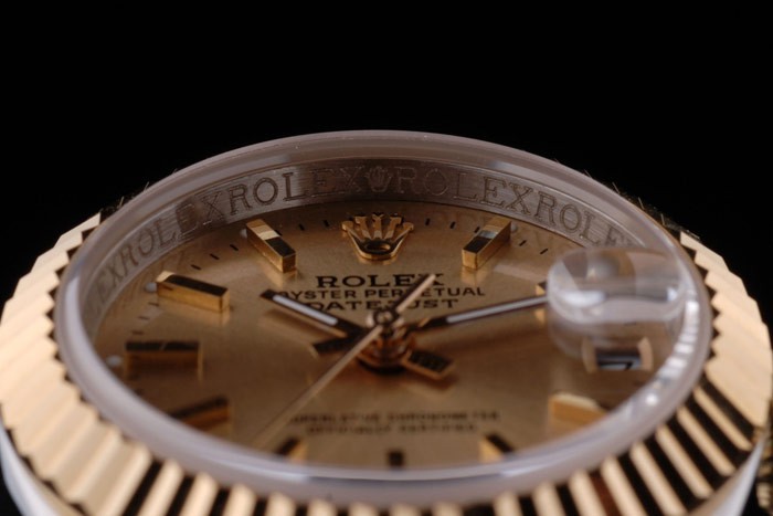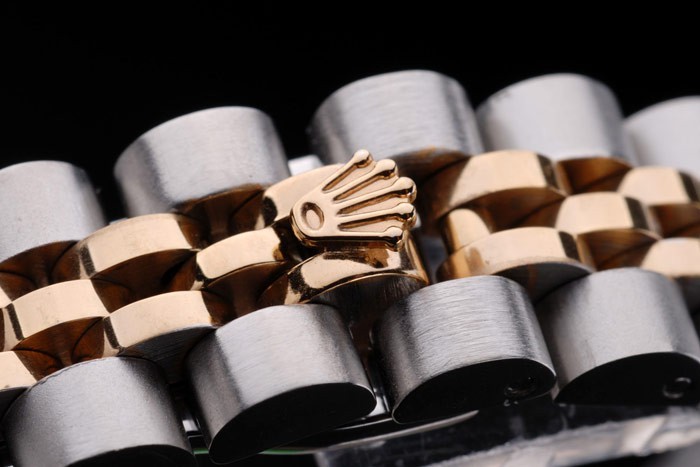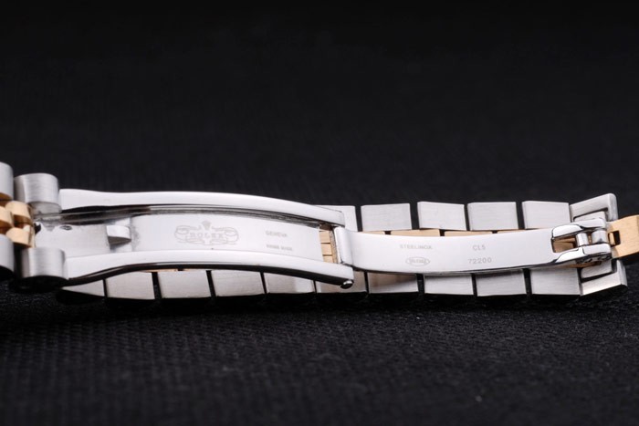 Caso de aço inoxidável: Pulseira: Duas pulseiras de links em aço inoxidável polido e aço amarelo 18k de aço banhado a ouro com Gravura de Rolex Clasp escondido exibindo o logotipo Rolex