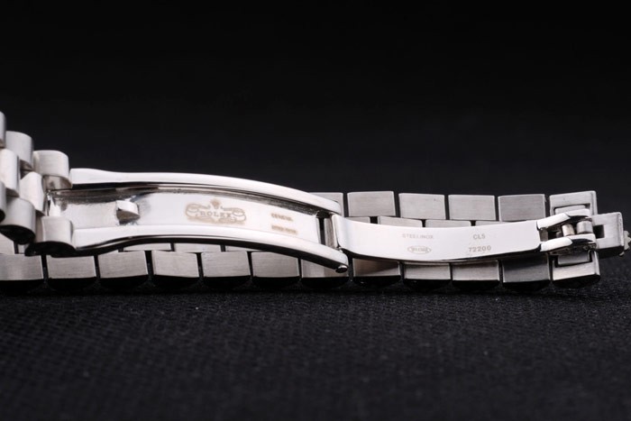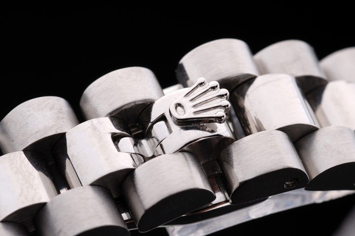 Caso de aço inoxidável: Pulseira: Bracelete escovado e polido de aço inoxidável com fecho de implantação de gravura Rolex, exibindo o logotipo Rolex