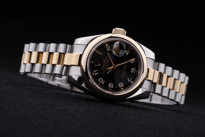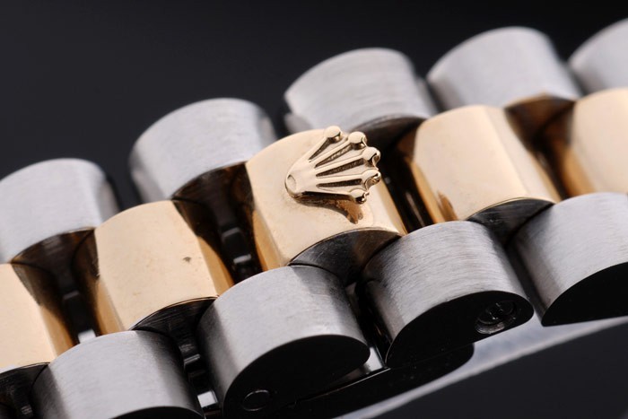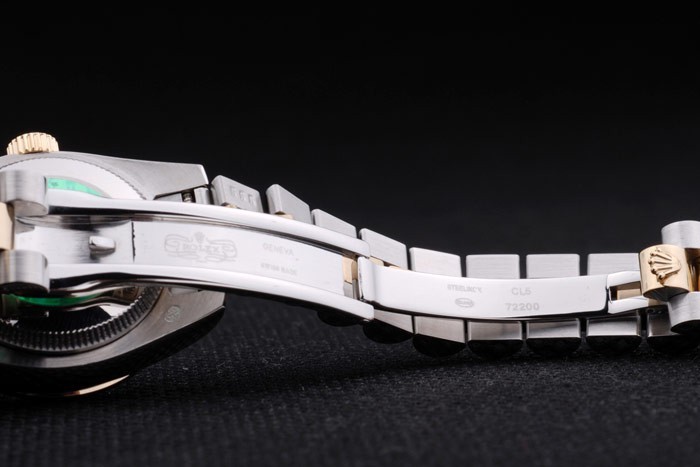 Caso de aço inoxidável: Pulseira: Duas pulseira tripla tonificada em aço inoxidável polido e aço amarelo 18k de aço banhado a ouro com rolex gravando clasp escondido exibindo o logotipo Rolex