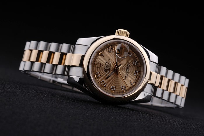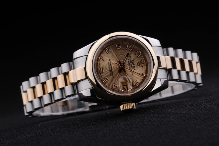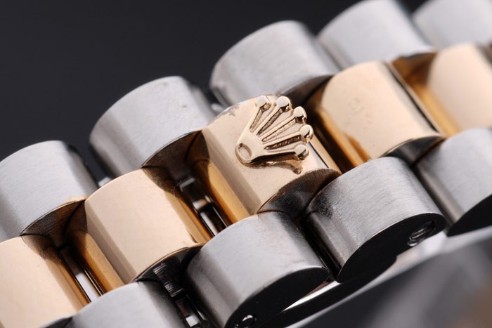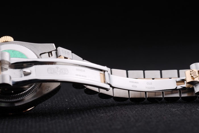 Caso de aço inoxidável: Pulseira: Duas pulseira tripla tonificada em aço inoxidável polido e aço amarelo 18k de aço banhado a ouro com rolex gravando clasp escondido exibindo o logotipo Rolex
