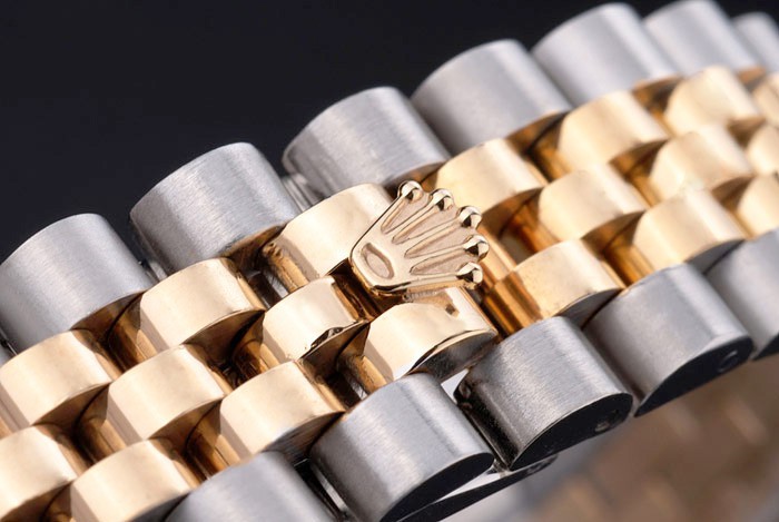 Caso de aço inoxidável: Pulseira: Dois tonificados pulseira de link em aço inoxidável polido e 18k amarelo aço banhado a ouro com garganta rolex fecho escondido exibindo o logotipo Rolex