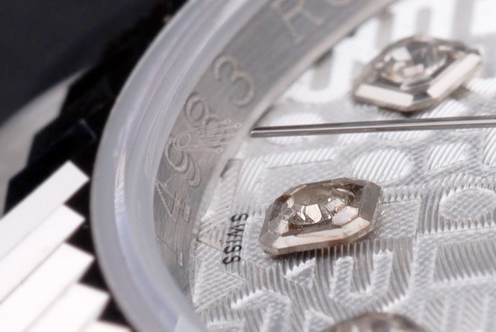 Pulseira: Bracelete de Aço Inoxidável Escovado e Polido com Rolex Clasp escondido exibindo o logotipo Rolex