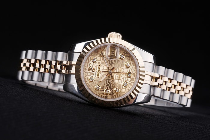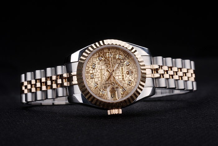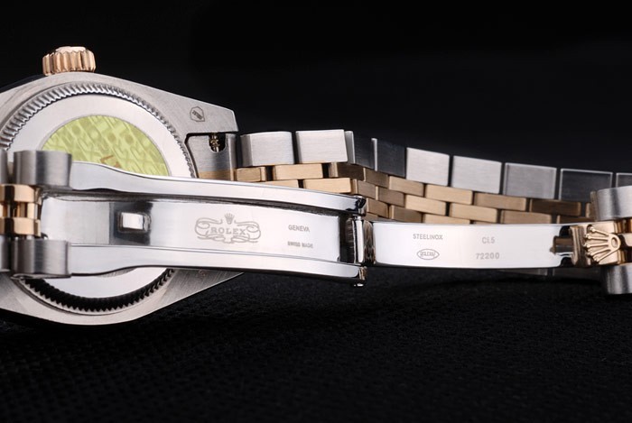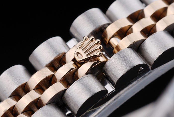 Caso de aço inoxidável: Bracelet: Duas pulseira de link tonificada em aço inoxidável escovado e aço amarelo 18k de aço banhado a ouro com rolex gravando clasp escondido exibindo o logotipo Rolex