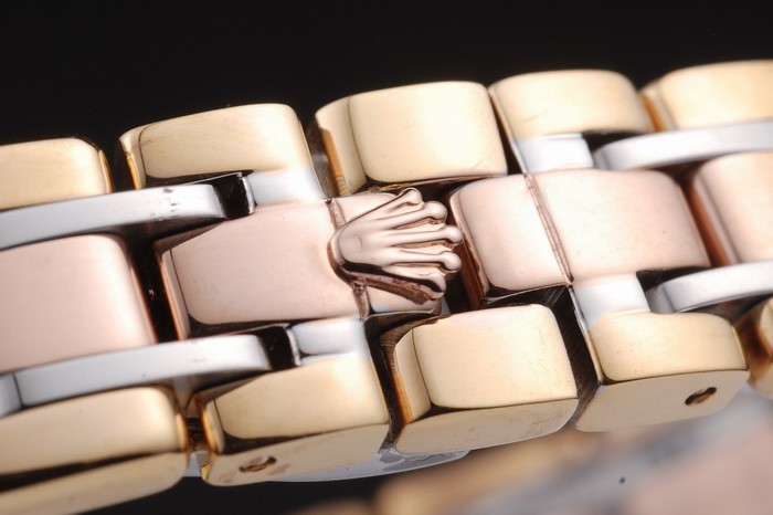 Pulseira: Duas bracelete de link fancy em tons em 18k rosa de aço inoxidável banhado a ouro e aço inoxidável polido com fecho escondido de gravação de Rolex exibindo o logotipo Rolex