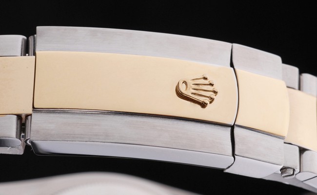 Capa: Pulseira: Pulseira: Duas pulseira de ligação em tons em aço inoxidável escovado e aço amarelo 18k de aço banhado a ouro com Gravura de Rolex Folha de implantação, exibindo o logotipo Rolex