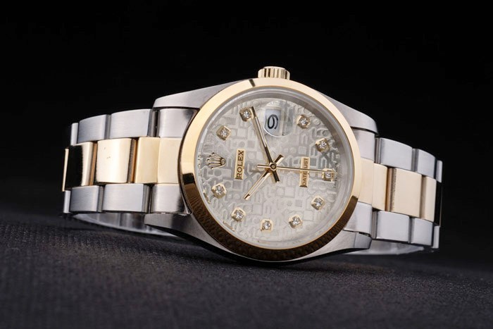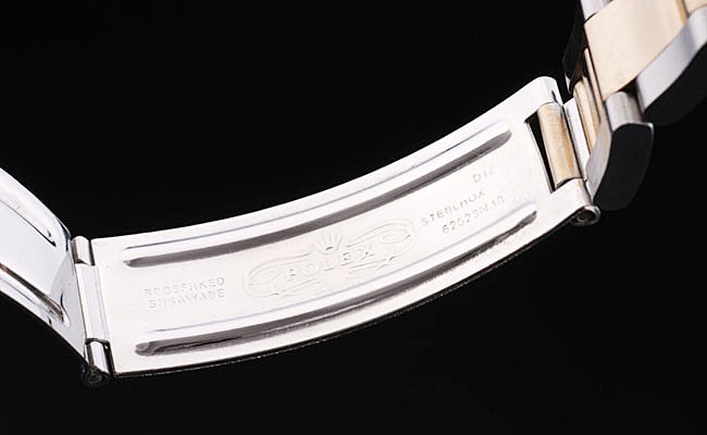 Capa: Pulseira: Pulseira: Duas pulseira de ligação em tons em aço inoxidável escovado e aço amarelo 18k de aço banhado a ouro com Gravura de Rolex Folha de implantação, exibindo o logotipo Rolex