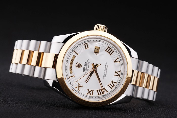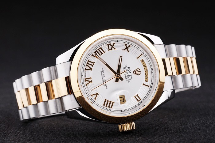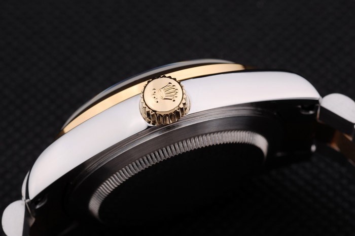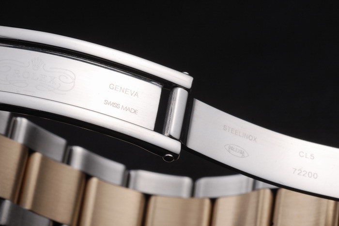 Cor: Caso de aço inoxidável escovado Pulseira: aço inoxidável escovado e corrente de link de ouro amarelo com fold sobre fecho e rolex coroa gravura