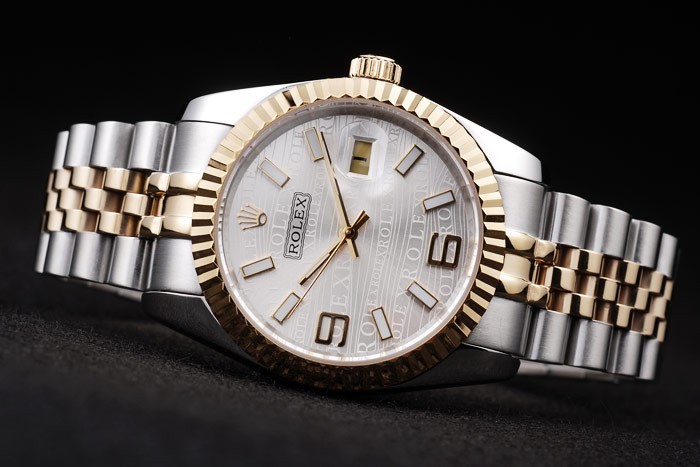 Capa: Pulseira: Pulseira: Duas pulseira de link em tons em aço inoxidável escovado e aço amarelo 18k de aço banhado a ouro com rolex gravado clasp escondido exibindo o logotipo Rolex