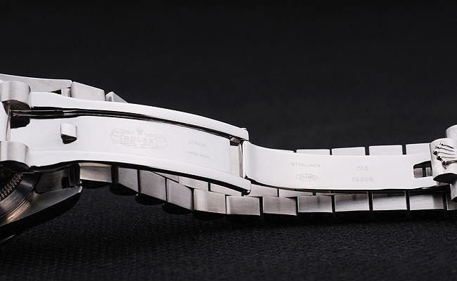 Capa: Pulseira: Pulseira: Bracelete de elo de aço inoxidável escovado e polido com Gravura Rolex fecho escondido exibindo o logotipo Rolex