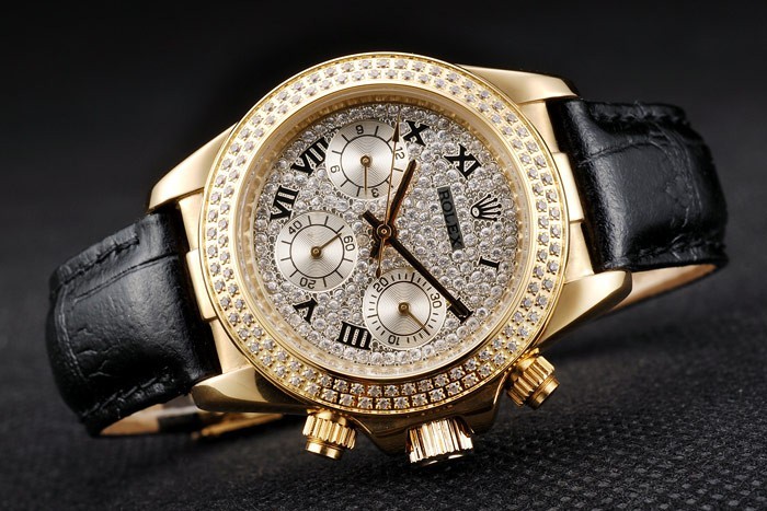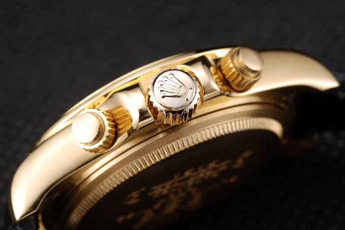 vidro: cristal de safira e coroa: 18k coroa de ouro amarelo com logotipo Rolex e duas coroas de botão de push de corte menor em ambos os lados dele