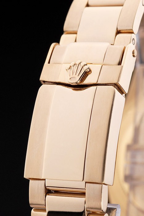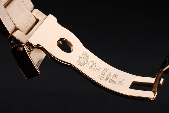Pulseira de link de aço inoxidável de ouro com fecho de implantação de gravura Rolex exibindo logotipo Rolex