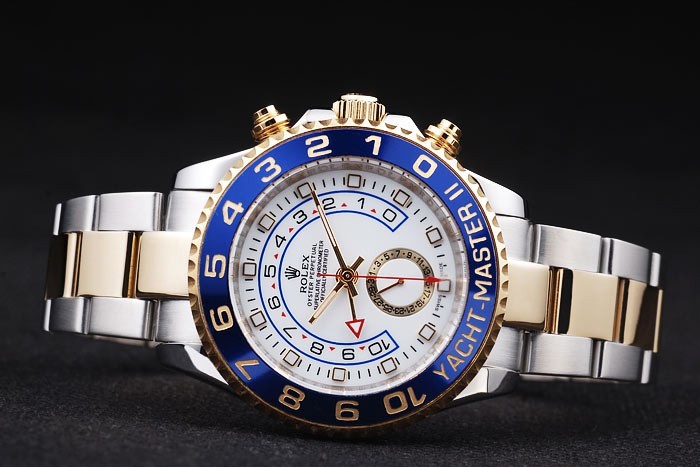 Bezel: Rose Gold Cutwork Unidirectional Bezel com 1 a 10 Marcações e iate mestre gravura em um fundo azul esmaltado