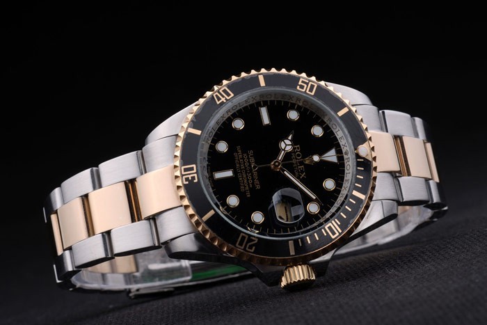 Caso de aço inoxidável: Bracelet: Duas bracelete de elo de aço inoxidável escovado e ouro tonificado com Rolex gravando dobra no fecho exibindo o logotipo Rolex