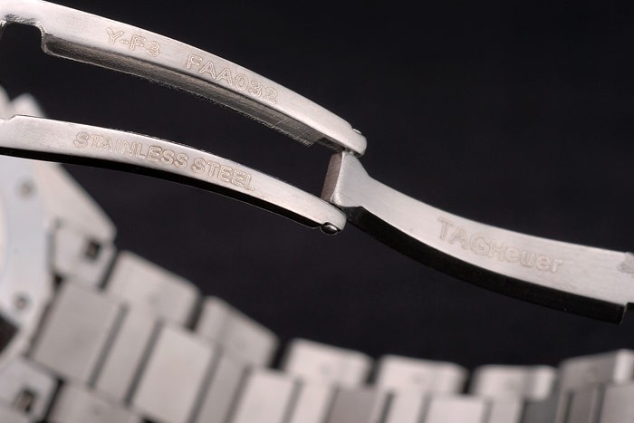 de vidro: Sapphire Cristal e coroa: polido Coroa de aço inoxidável de aço inoxidável com tag Heuer logotipo e dois longos coroas de botão de pushwork em ambos os lados junto com uma coroa de corte no lado oposto