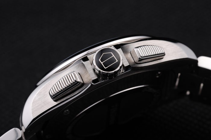 coroa: coroa de aço inoxidável de aço inoxidável com tag heuer logotipo preto esmalte prisioneiro e dois longos coroas de botão de pressão com nervuras em ambos os lados, mais Uma coroa de corte do logotipo do Heuer da etiqueta adicional no lado oposite