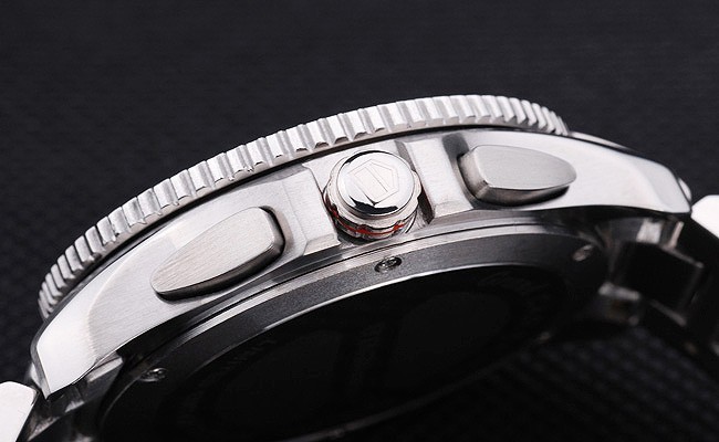 coroa: coroa de aço inoxidável polido coroa com tag heuer logotipo mais duas coroas adicionais em ambos os lados e um no canto superior oposto
