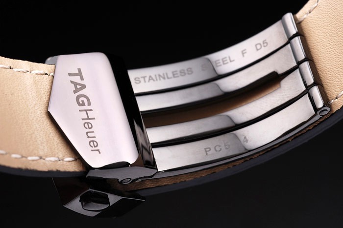 Pulseira: Cinta de couro de crocodilo preta com tag de selo gravado de calor e fecho de liberação de push-lançamento banhado a íon com o logotipo do heuer da etiqueta na parte superior