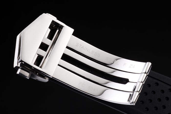 Pulseira: Correia de borracha preta perfurada com obra de aço inoxidável escovado dobra no fecho com a gravura heuer da etiqueta da etiqueta