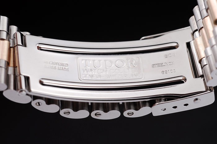 Pulseira : Dois tonificados escovados de aço inoxidável e pulseira de link banhado a ouro amarelo com gravuras de Tudor e fecho de liberação de pressão com o logotipo do Tudor na parte superior